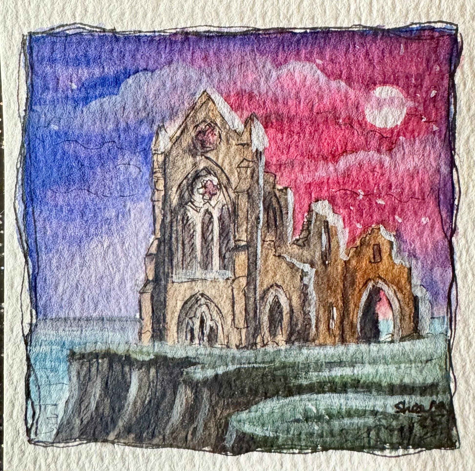 Love the slightly spooky gothic vibe of this little painting. I wanted the sky to be full of colour and drama.